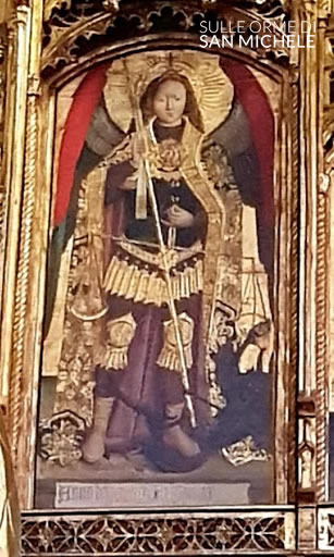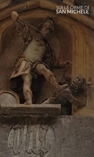 Nel centro è raffigurato San Michele che trafigge il demonio nell’intento di rubargli un’anima dal piatto della bilancia: davvero insolito!