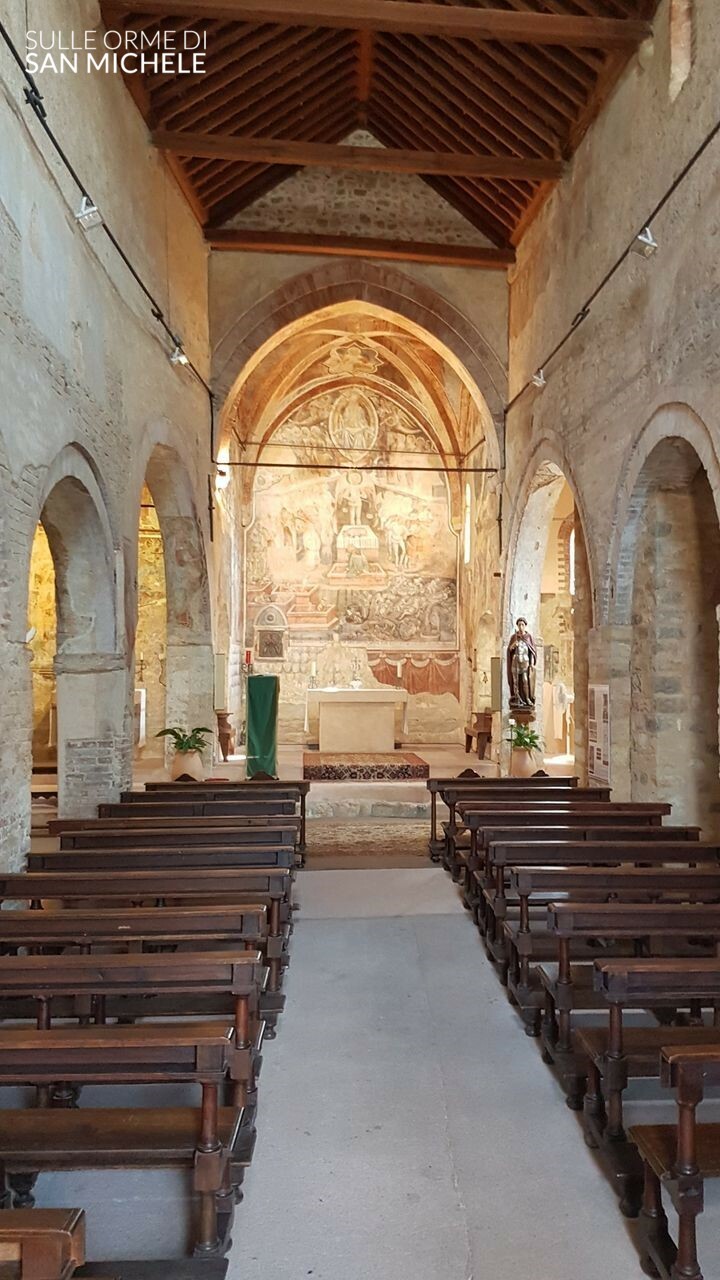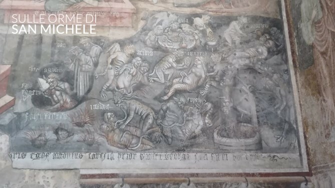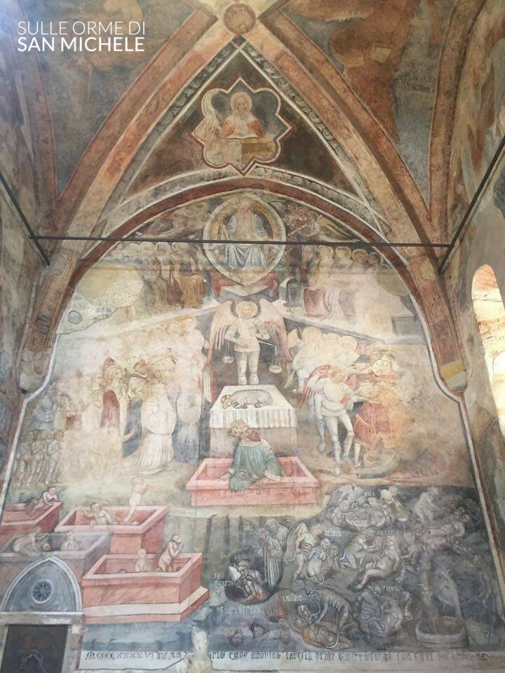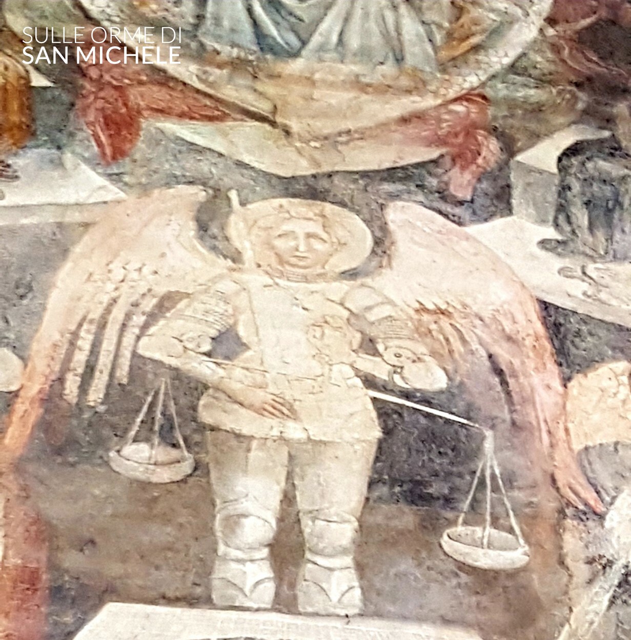 I Templari si incaricavano, in particolar modo, dell’assistenza ai pellegrini. Ma che cosa lega questa chiesa a Michele Arcangelo (oltre al fatto che San Giorgio è un po’ il suo alter ego terreno)? San Michele compare nel magnifico affresco che occupa tutta la parete dell’abside.